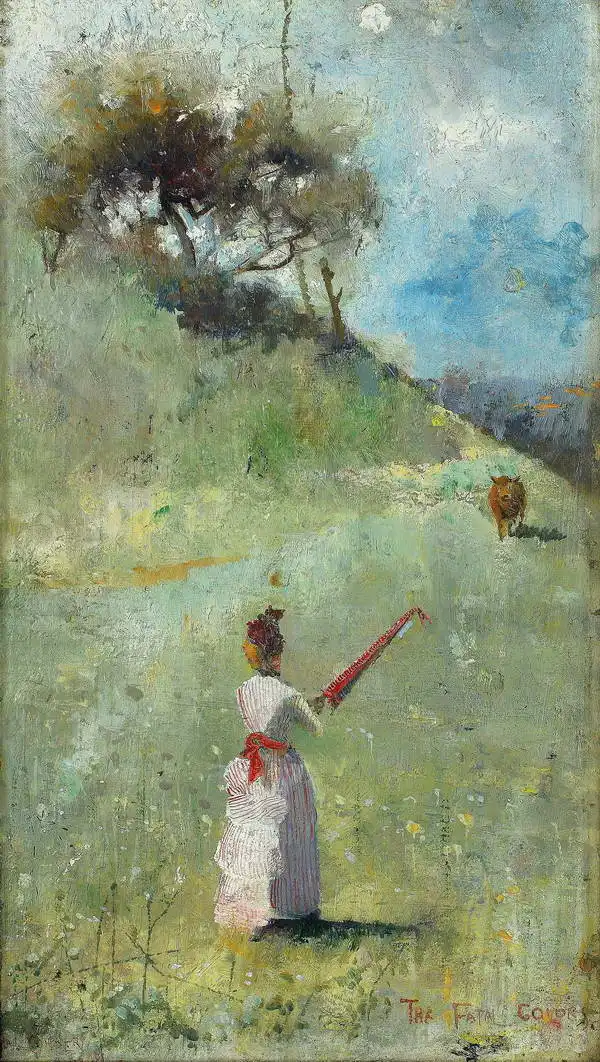 1888The painting shows a woman in period clothing from behind, standing in a meadow looking at a small dog in front of her. The woman is holding a red parasol and is wearing a white dress with a red belt. A tree and blue sky with clouds can be seen in the background. The overall impression is idyllic and peaceful, with a touch of nostalgic charm of the past. The work is painted in oil paints with loose brushstrokes typical of Impressionism.