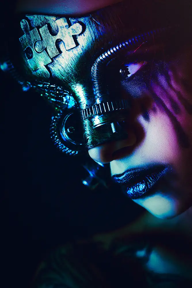 #dark #low key #low-key #pruple #color #colors #colorful #portrait #creative edit #puzzle #puzzle pieces #face #cyborg #future #futuristic #metal #lips #no background #dark background #black background #girl #model #woman #cog #cogs #cog wheel #cog wheels #gears #colour #colourful #person #figurative #people #lip #mouth #plain background #female