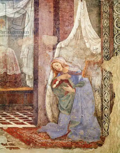 San Martino del Vescovo, Florence, Italy Botticelli painted picture Annunciation, detail of the virgin in 1481. Prevailing color of this fine art print is brown and its shape is portrait. This art piece is located in San Martino del Vescovo, Florence, Italy. This image is printed on demand - you can choose material, size and finishing.