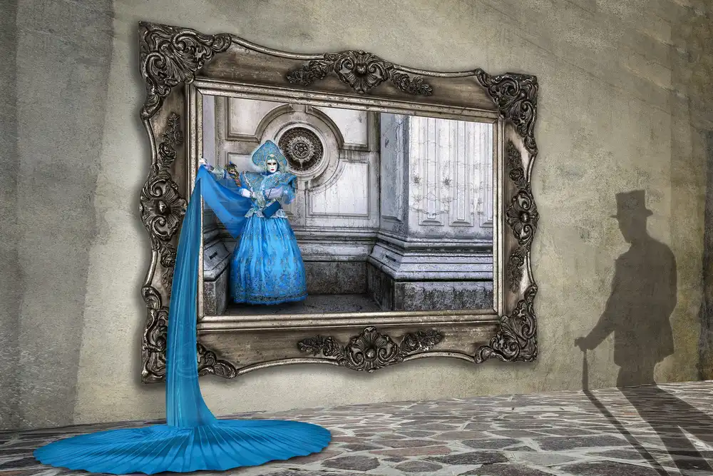 #creative edit #venice #italy #venetian #mask #masks #shadow #dress #blue #mirror #vintage #surreal #fantasy #imagination #hat #stick #cane #costume #europe #places #travel #tourism #masked #shadows #reflection #surrealism #surrealistic #composite #montage #surrealist