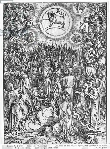 39.2 x 28.1 Dürer painted picture Scene from the Apocalypse, Adoration of the Lamb, German edition in 1498. Prevailing color of this fine art print is green and its shape is portrait. Original size is 39.2 x 28.1. This art piece is located in Bibliotheque Nationale, Paris, France. This image is printed on demand - you can choose material, size and finishing.
