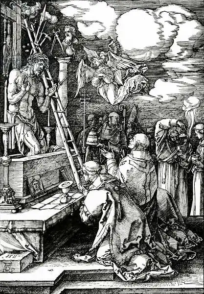 private collection Dürer painted picture The Mass of St. Gregory in 1511. Prevailing color of this fine art print is green and its shape is portrait. This art piece is located in a private collection This image is printed on demand - you can choose material, size and finishing.