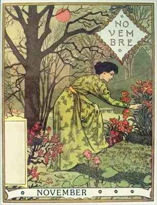 The picture is an artistic illustration of a woman bending over blooming flowers in a garden. She is dressed in a long green dress and appears to be picking or admiring the flowers. Behind her is a tree with orange fruit and at the top of the picture is the inscription 'NOVEMBER'. The design is heavily inspired by the Art Nouveau style, including decorative elements and stylized lettering. The lower part contains the word "NOVEMBER" in the middle and is surrounded by decorative elements.