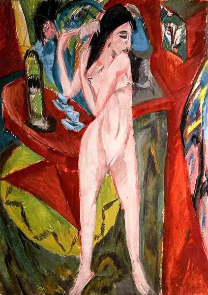 125 x 90 Kirchner painted picture Nude Woman Combing Her Hair in 1913. Prevailing color of this fine art print is red and its shape is portrait. Original size is 125 x 90. This art piece is located in Brucke Museum, Berlin, Germany. This image is printed on demand - you can choose material, size and finishing.