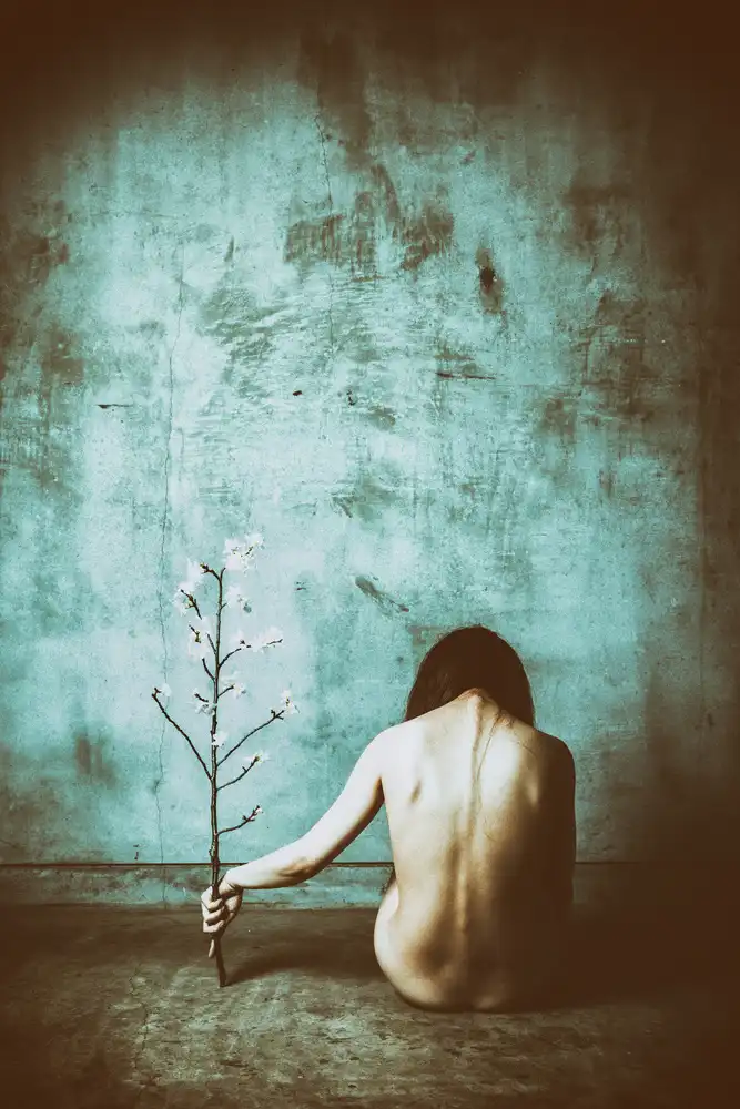 #fine art nude #nude #naked #girl #model #woman #nudes #erotic #sexy #sit #sititng #twig #behind #back #anonymous #spine #teal #turquoise #sensual #sensuality #figurative #portrait #female #person #people #sitting