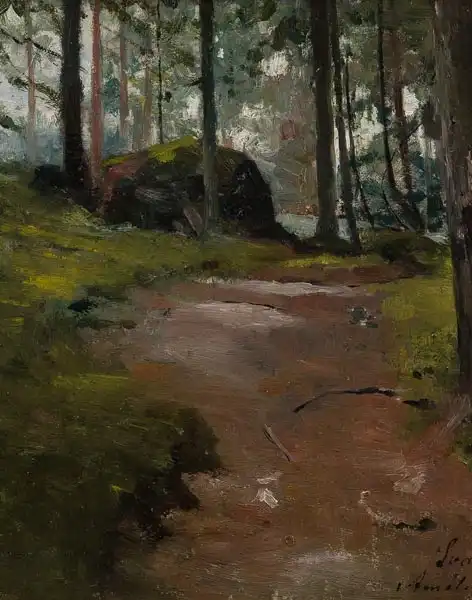 Lundahl painted picture Forest path in purola in 1890. Prevailing color of this fine art print is green and its shape is portrait. This image is printed on demand - you can choose material, size and finishing.