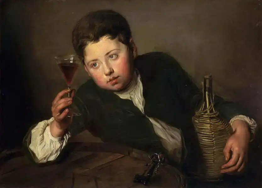 The painting depicts a young boy in historical clothing sitting at a wooden table holding a cup of wine. His face expresses thoughtfulness or intoxication. A wine bottle wrapped in a wicker basket and a heavy key are visible on the table next to him. The background is dark, emphasizing the details in the foreground.
