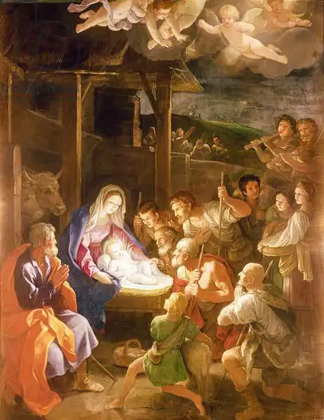 Reni painted picture The Nativity at Night in 1640. Prevailing color of this fine art print is brown and its shape is portrait. Original size is 480 x 321. This art piece is located in National Gallery, London, UK. This image is printed on demand - you can choose material, size and finishing.
