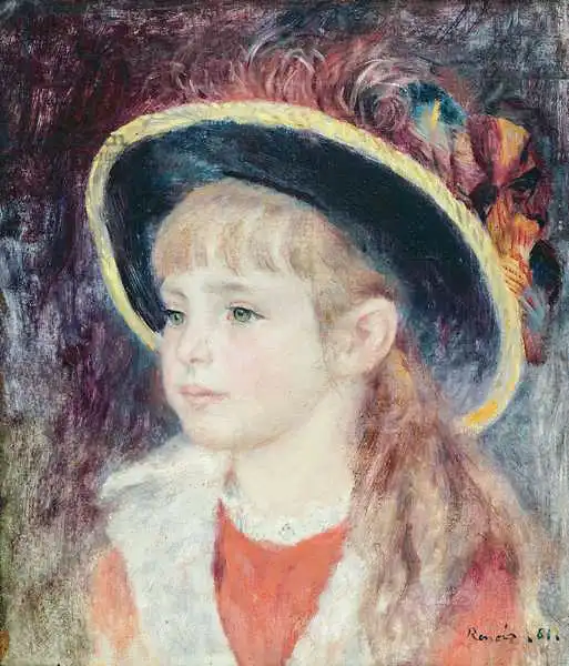 40 x 35 Renoir painted picture Portrait of a Young Girl in a Blue Hat in 1881. Prevailing color of this fine art print is green and its shape is portrait. Original size is 40 x 35. This art piece is located in a private collection This image is printed on demand - you can choose material, size and finishing.