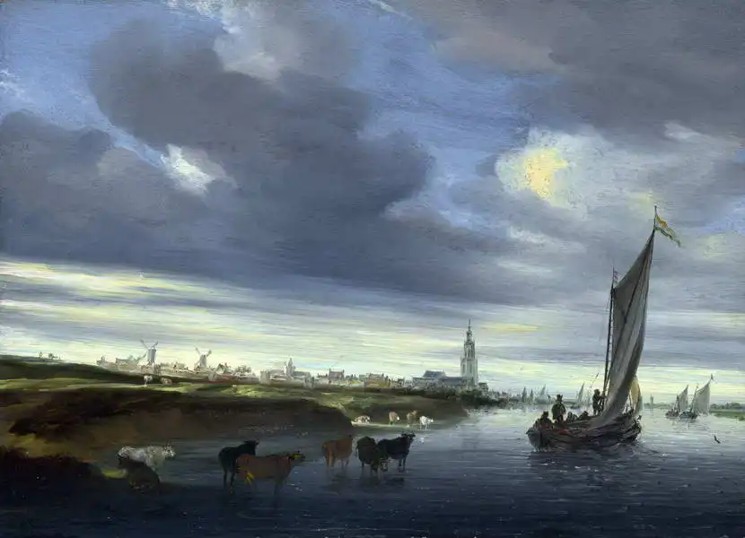 The painting depicts a dramatic landscape scene with dark clouds and a hint of the rising or setting sun. In the foreground are cattle drinking by a body of water, while a boat with an inflated sail floats in the center. The outline of a town with windmills and church spires can be seen in the distance, suggesting a Dutch landscape.