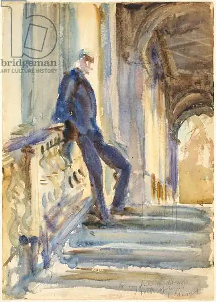 35.6 x 25.3 Sargent painted picture Sir Neville Wilkinson on the Steps of the Palladian Bridge at Wilton House, 1904-5 in 1904. Prevailing color of this fine art print is orange and its shape is portrait. Original size is 35.6 x 25.3. This art piece is located in National Gallery of Art, Washington DC, USA. This image is printed on demand - you can choose material, size and finishing.