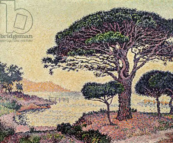 65 x 81 Signac painted picture Umbrella Pines at Caroubiers in 1898. Prevailing color of this fine art print is brown and its shape is landscape. Original size is 65 x 81. This art piece is located in Musee de lAnnonciade, Saint-Tropez, France. This image is printed on demand - you can choose material, size and finishing.
