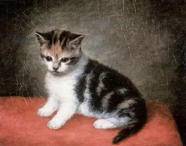 Stubbs painted picture Miss Ann White's Kitten in 1790. Prevailing color of this fine art print is dark and its shape is landscape. Original size is 25.4 x 30.5. This art piece is located in a private collection This image is printed on demand - you can choose material, size and finishing.