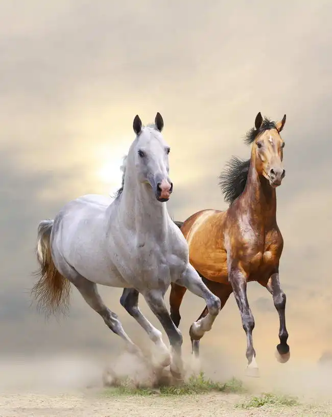 The picture shows two horses in motion. On the left side is a white horse running in the foreground and on the right side is a bay horse. Both horses express dynamic movement, their manes and tails are shaking and lifting dust from the ground. The background of the painting is indistinct and has muted tones, which enhances the movement and beauty of these animals.