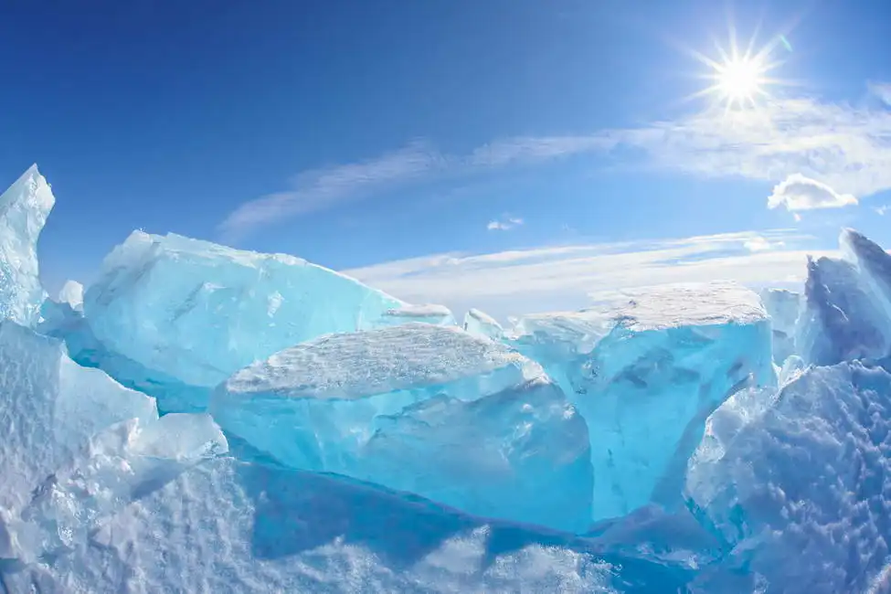 The picture shows a glacial landscape with turquoise blue ice formations protruding from the white snow. The sun in the blue sky adds brightness to the scene and the light reflects off the ice surfaces, creating a dazzling effect. The whole scene has a cold and clean feel, reminiscent of the inhospitable but beautiful environment of the polar regions.