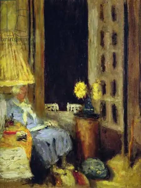 55.2 x 46.2 Vuillard painted picture Madame Hessel in her Sitting Room (Chateau des Clayes), the Window opened into the Night, 1926-1939 in 1926. Prevailing color of this fine art print is green and its shape is portrait. Original size is 55.2 x 46.2. This art piece is located in a private collection This image is printed on demand - you can choose material, size and finishing.