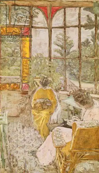 200 x 90 Vuillard painted picture Two Women Embroidering on a Veranda in 1913. Prevailing color of this fine art print is brown and its shape is portrait. Original size is 200 x 90. This art piece is located in Musee d'Orsay, Paris, France. This image is printed on demand - you can choose material, size and finishing.