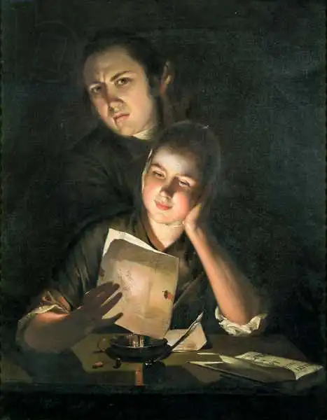 Wright, Joseph: A Girl reading a letter by Candlelight, with a Young Man peering over her shoulder, c.1760-2