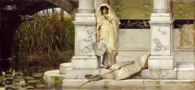 Lawrence Alma-Tadema (1836-1912). British painter of Dutch origin. He was educated at the Royal Academy of Antwerp. In 1870 he settled in England. Painted classical motifs - mostly luxury (and decadence) of the Roman Empire, its stature has advocated to the beautiful marble interior, against the background of dazzling blue sea and sky. Detailed and realistic prokresloval objects in his paintings, masterfully managed reflections marble, metal objects. He was obsessed with precision - often painted architecture or things according to reality (perhaps in a museum). He kept the flowers from Africa carry a large rush is painted until the fresh ... During his life he was an important painter of the Victorian era and gained a good position. After his death, his importance in the eyes of critics fell, but by the 60s of the last century is once again becoming popular and award-winning author.