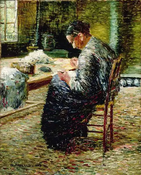 Angrand painted picture Portrait of the Artist's Mother Sewing in 1885. Prevailing color of this fine art print is green and its shape is portrait. This art piece is located in Petit Palais, Geneva, Switzerland. This image is printed on demand - you can choose material, size and finishing.