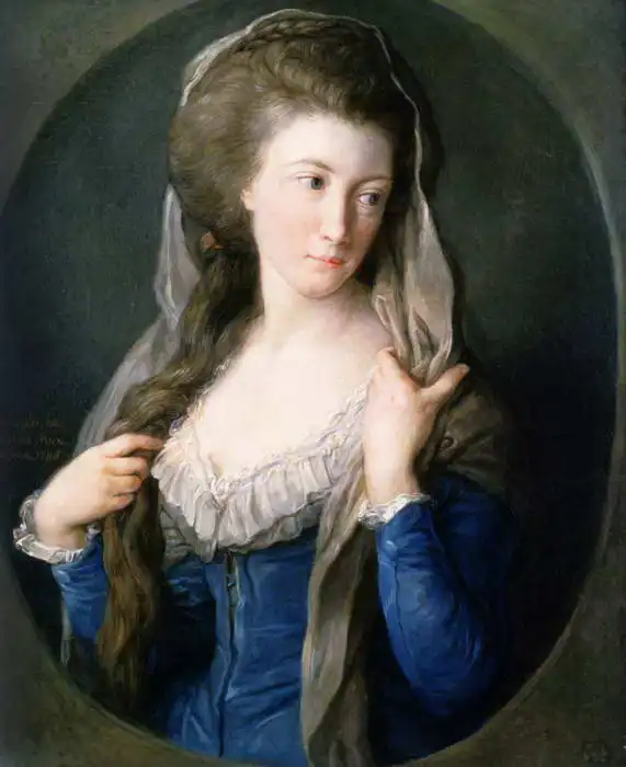 The picture shows a portrait of a woman from the 18th century. The woman is wearing a richly decorated blue dress with white lace details and wide sleeves. Her long brown hair is partially covered by a thin transparent veil and falls loosely over her shoulder. Her facial expression is thoughtful and slightly sideways, with slightly flushed cheeks and red lips. Overall, the image is elegant and reflects the fashion and aesthetic of the time.