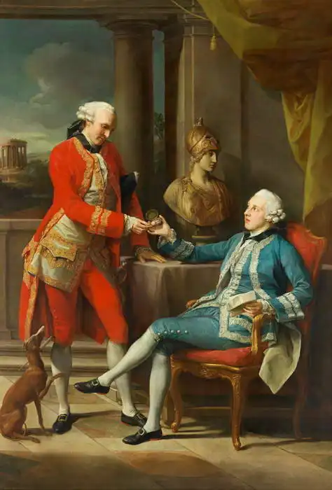 The painting depicts two historical figures in a setting reminiscent of a palace or mansion. The painting shows one man seated in a chair wearing a blue dress with white stockings, the second man in a standing position wearing a red uniform and handing the first man an object. A colonnade and balcony can be seen in the background. A dog stands in the lower left corner. The overall impression is solemn and both men appear to be important figures.