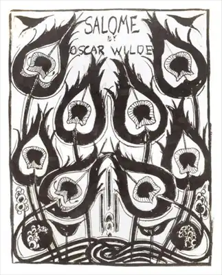 private collectionThe image is an artistic representation titled "Salome" by Oscar Wilde. It is an illustration that includes stylized water lily flowers as the dominant motif. The flowers are placed on both sides of the picture and also form a sort of gateway or portal. A stylized gateway or entrance can be seen at the bottom center, which is flanked by lush floral decoration. The whole image has dark and dramatic tones with great attention to detail and ornamentation.