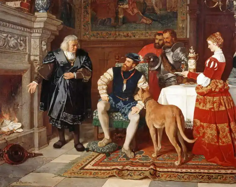 Becker painted picture Jakob Fugger burnt diary of Charles V. in 1866. Prevailing color of this fine art print is vivid and its shape is landscape. This image is printed on demand - you can choose material, size and finishing.