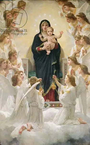 285 x 185 Bouguereau painted picture The Virgin with Angels in 1900. Prevailing color of this fine art print is green and its shape is portrait. Original size is 285 x 185. This art piece is located in Musee de la Ville de Paris, Musee du Petit-Palais, France. This image is printed on demand - you can choose material, size and finishing.