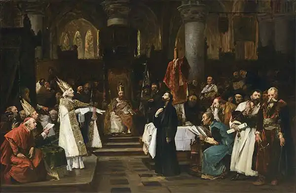 religious themes. The painting depicts Jan Hus, a Czech reformer and preacher who was executed for heresy during the Council of Constance in Constance in 1415. Hus is captured standing in front of the conciliar assembly in Kostna Cathedral. The main part of the painting is the interior of the Kostna Cathedral, which served as the venue for the council.
