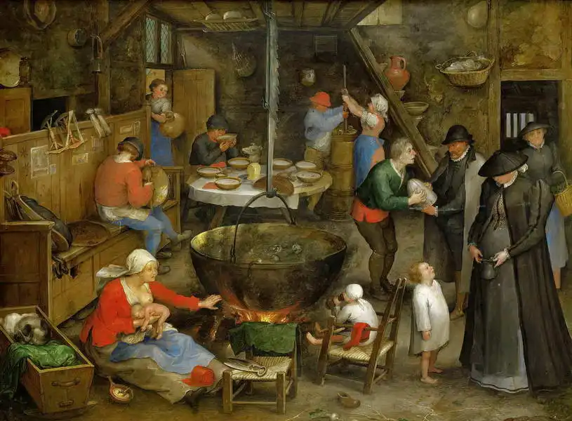 The painting represents a vivid scene of life during the Renaissance. It depicts the bustle of a medieval kitchen, where people dressed by hand perform various activities. In the centre is a large open fire with a cauldron around which people of both high and low social status are gathered. In the background we can read about food preparation, serving and dining. The scene is full of details of domestic life and the atmosphere of the time.