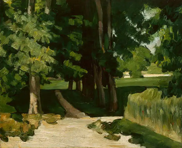 The painting shows a forest path leading through a shady grove. Shading and light are captured by a series of colour strokes, showing variations of green and brown. Tall trees with rich foliage surround it, reflecting the warm sunlight shining through the treetops. The road disappears into the distance, suggesting a peaceful and quiet atmosphere. Overall, the work evokes tranquility and natural beauty.