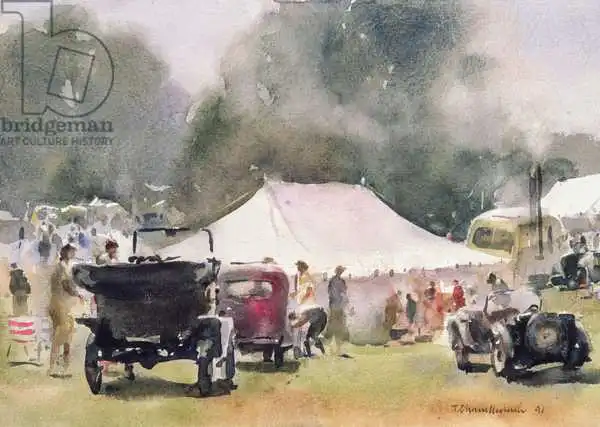 Chamberlain painted picture Vintage Motor Rally in 1991. Prevailing color of this fine art print is green and its shape is landscape. Original size is 17.7 x 25.4. This art piece is located in a private collection This image is printed on demand - you can choose material, size and finishing.