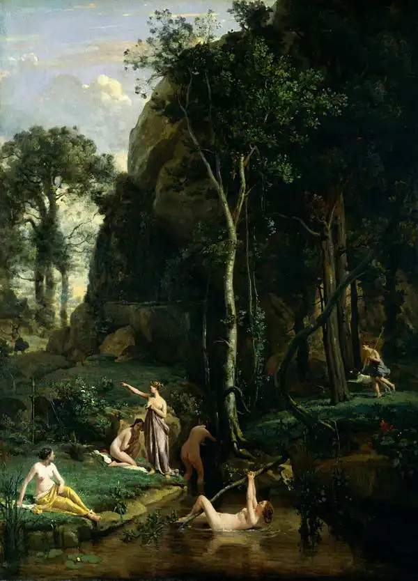Corot painted picture Diana and Actaeon (Diana surprised in the bath) in 1836. Prevailing color of this fine art print is dark and its shape is portrait. This image is printed on demand - you can choose material, size and finishing.