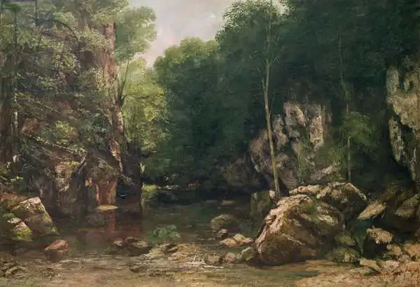 94 x 135 Courbet painted picture The Covered Stream, or The Dark Stream in 1865. Prevailing color of this fine art print is green and its shape is landscape. Original size is 94 x 135. This art piece is located in Musee d'Orsay, Paris, France. This image is printed on demand - you can choose material, size and finishing.