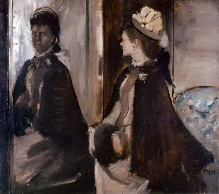 The painting depicts two people, probably women, dressed in period costumes. On the left side is a person with dark hair, who is wrapped in a heavy dark cloth, with her gaze directed towards a mirror. On the right is a second person, also in dark clothing, wearing a hat with decorations, sitting and looking to the side. The scene appears calm with attention to detail in the clothing and interior, including a blue patterned element in the background.