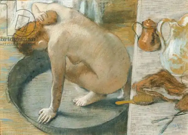 60 x 83 Degas painted picture The Tub in 1886. Prevailing color of this fine art print is green and its shape is landscape. Original size is 60 x 83. This art piece is located in Musee d'Orsay, Paris, France. This image is printed on demand - you can choose material, size and finishing.