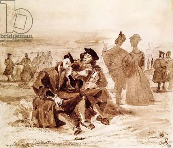 Louvre (Cabinet de dessins), Paris, France Delacroix painted picture Faust and Wagner in conversation in the countryside, from 'Faust' by Johann Wolfgang von Goethe (1749-1832) 1827 in 1827. Prevailing color of this fine art print is brown and its shape is landscape. This art piece is located in Louvre (Cabinet de dessins), Paris, France. This image is printed on demand - you can choose material, size and finishing.