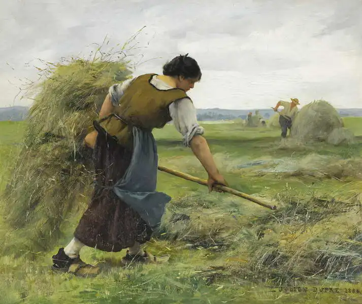 The painting depicts a woman in traditional dress, working in the fields. The woman is wearing a white blouse, a grey skirt and a yellow apron, with a ponytail, and is working with a pitchfork, folding hay. In the distance, other people working in the field and piles of hay are visible. The sky is cloudy, which adds a melancholy touch to the scene. Overall, the painting exudes an atmosphere of rural work and simple life.