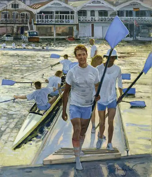 Easton painted picture Evening Return, Henley in 1998. Prevailing color of this fine art print is green and its shape is portrait. Original size is 40.6 x 35.6. This art piece is located in a private collection This image is printed on demand - you can choose material, size and finishing.