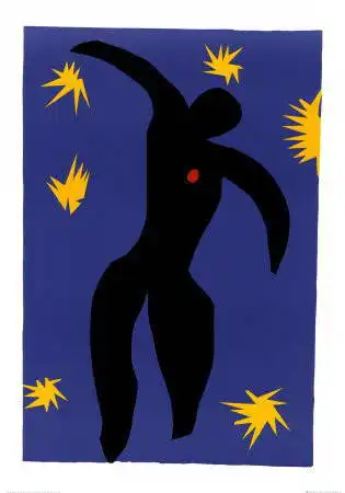 The picture shows a stylized depiction of a black figure on a blue background. The figure has his arms raised and appears to be dancing or in motion. Around the figure are yellow stars of different sizes, giving the impression that the figure is in outer space or in a fantasy world. The red circle in the figure's chest area adds an interesting detail. The overall impression is very abstract and artistic.