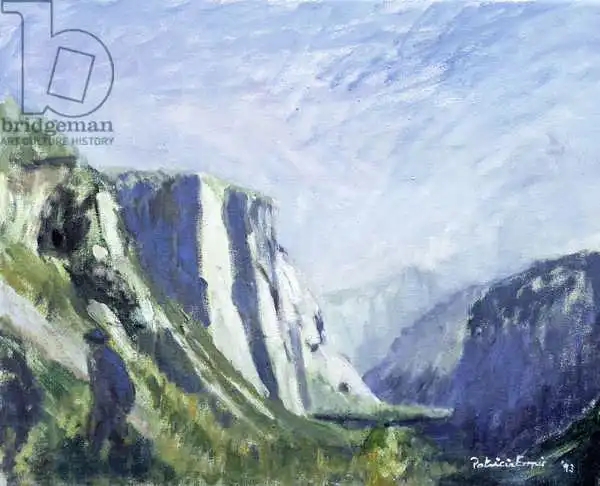 Espir painted picture El Capitan, Yosemite National Park in 1993. Prevailing color of this fine art print is blue and its shape is landscape. This art piece is located in a private collection This image is printed on demand - you can choose material, size and finishing.