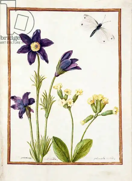 PD.126-1973f.23 Anemone pulsatilla, Primula veris and a Cabbage White Butterfly