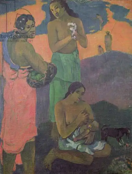 94 x 72 Gauguin painted picture Maternity, or Three Women on the Seashore in 1899. Prevailing color of this fine art print is green and its shape is portrait. Original size is 94 x 72. This art piece is located in Hermitage, Sant Peterburg, Russia. This image is printed on demand - you can choose material, size and finishing.