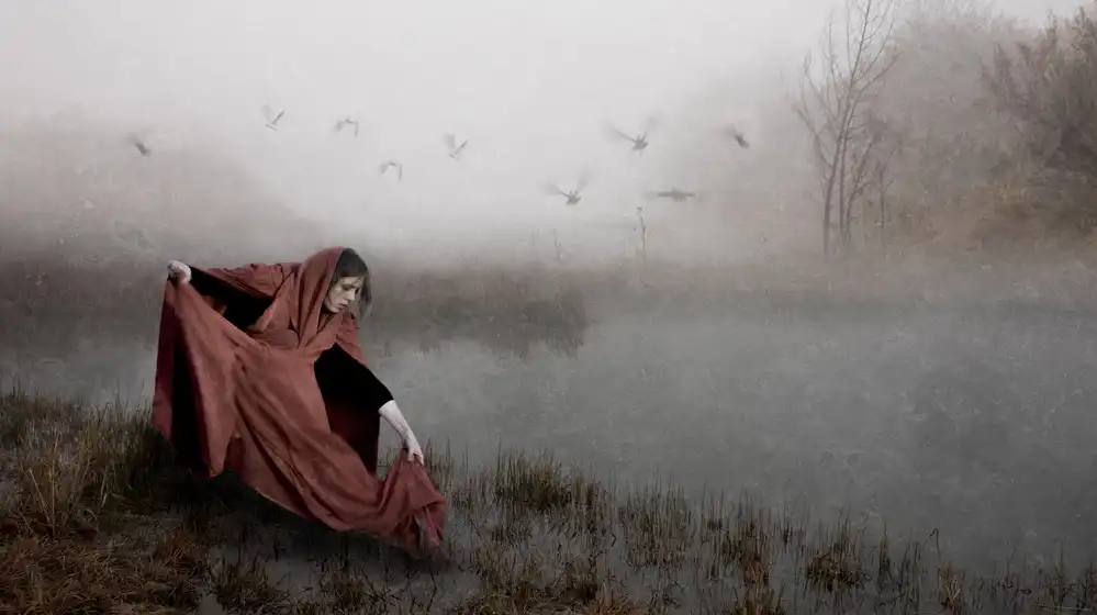 #mood #red #water #model #misty #panorama #panoramic #creative edit #lake #landscape #waterscape #landscapes #forest #woods #trees #tree #fog #foggy #mist #haze #autumn #fall #dress #pose #girl #woman #female #person #people #portrait #figurative #filter #texture #birds