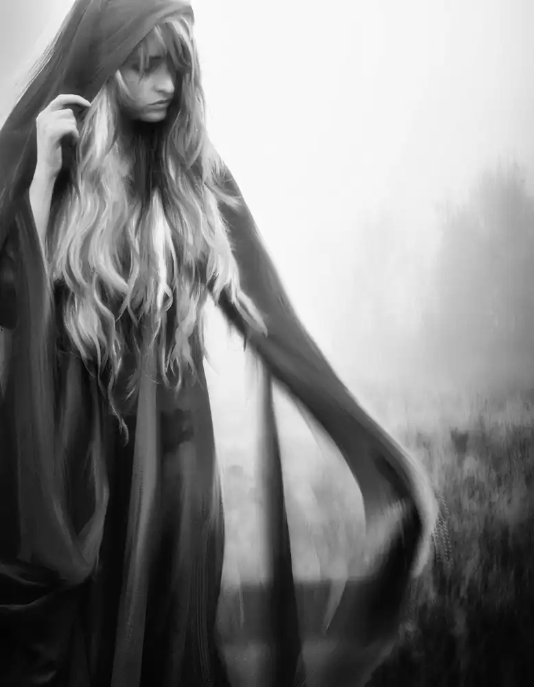 #model #creative edit #portrait #outside #outdoors #bw #hair #robe #cape #painterly #person #figurative #people #girl #woman #female #blonde #blondes #veil #black and white #monochrome #face
