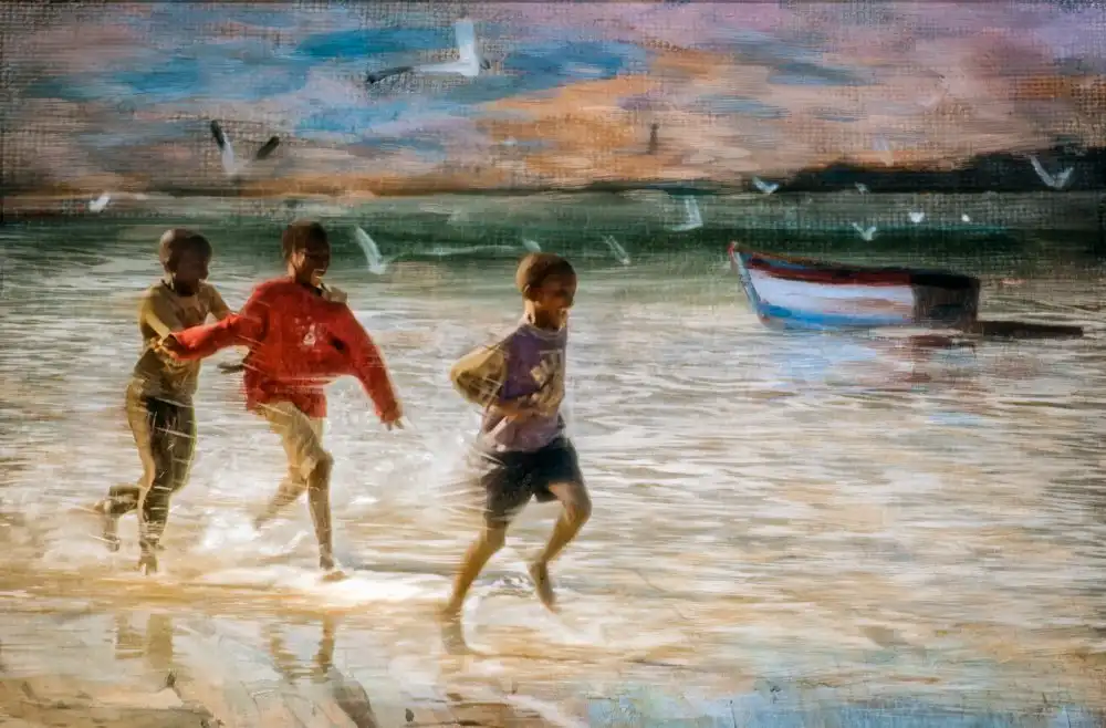 #creative edit #painterly #beach #water #boat #kids #kid #boy #boys #happy #smile #glad #fun #run #running #coast #coastal #transkei #africa #seagulls #play #playing