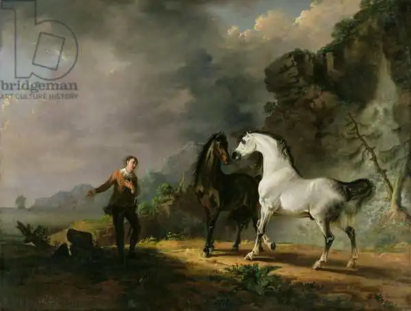 Gilpin painted picture Gulliver Addressing the Houyhnhnms in 1769. Prevailing color of this fine art print is green and its shape is landscape. Original size is 104 x 139.8. This art piece is located in Yale Center for British Art, Paul Mellon Collection, USA. This image is printed on demand - you can choose material, size and finishing.