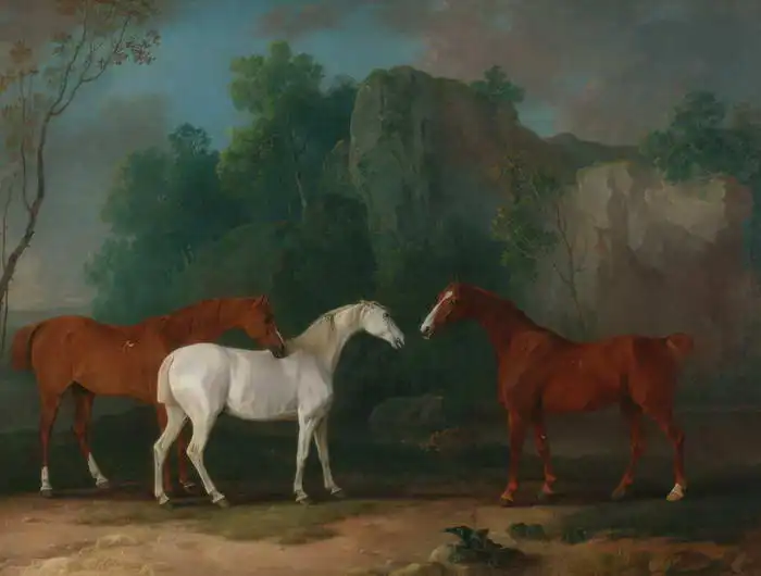 The painting depicts three horses in a natural landscape. The two stallions in the foreground, one white and one brown, are watching each other and there seems to be a certain tension or competition between them. The third horse, also brown, stands in the background and turns away. The picture has a peaceful atmosphere with soft lighting and shadowy spots. In the background is a rock surrounded by trees, suggesting an outdoor setting. At the bottom right is a small patch of green with a small black bird or frog.