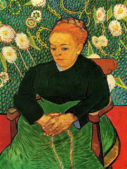 The painting depicts a woman sitting on a wooden chair. She is dressed in a dark dress with long sleeves and a green skirt. The background is vibrant colours, mostly green and red, with strong floral motifs. The woman's hair is pulled back into a bun and she has a serious expression on her face. The style of the painting shows a post-impressionist approach with rough brushstrokes and a rich palette of colours.